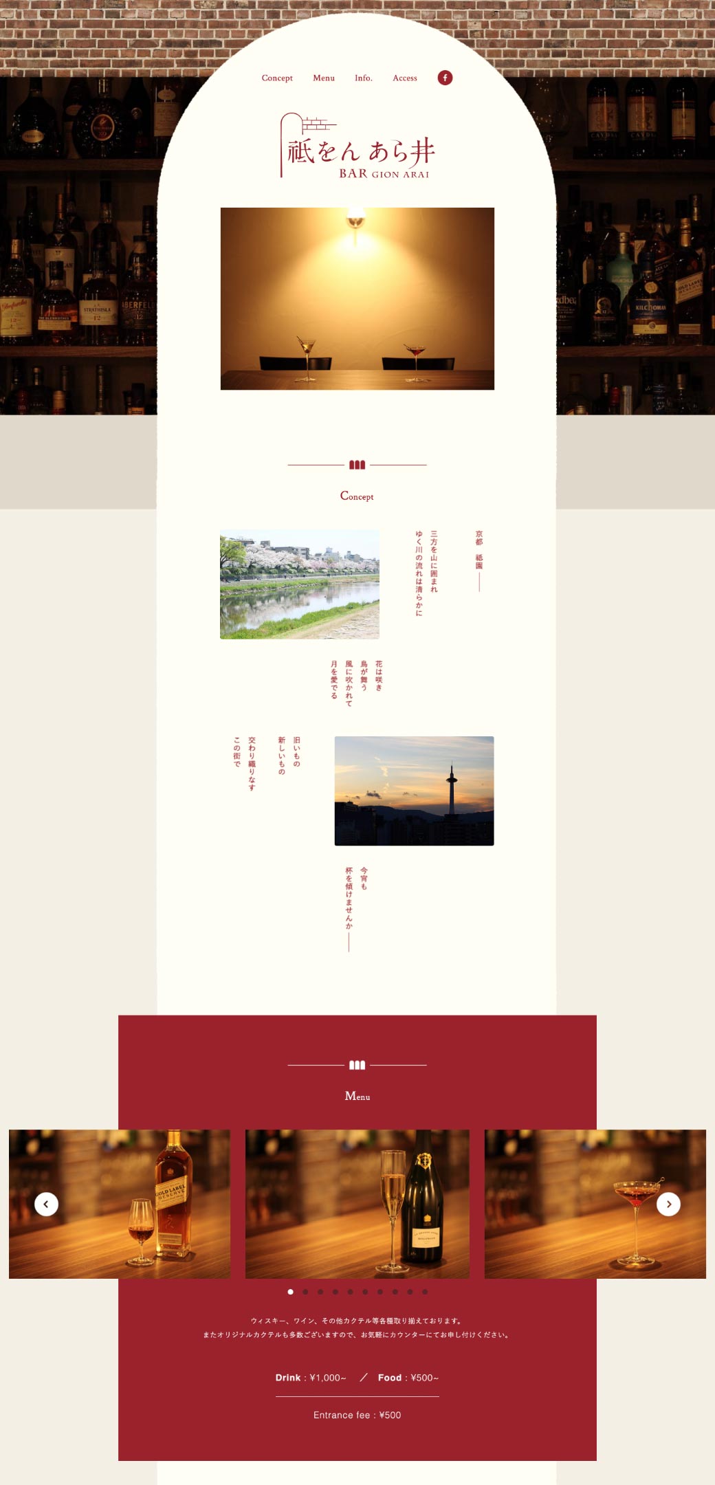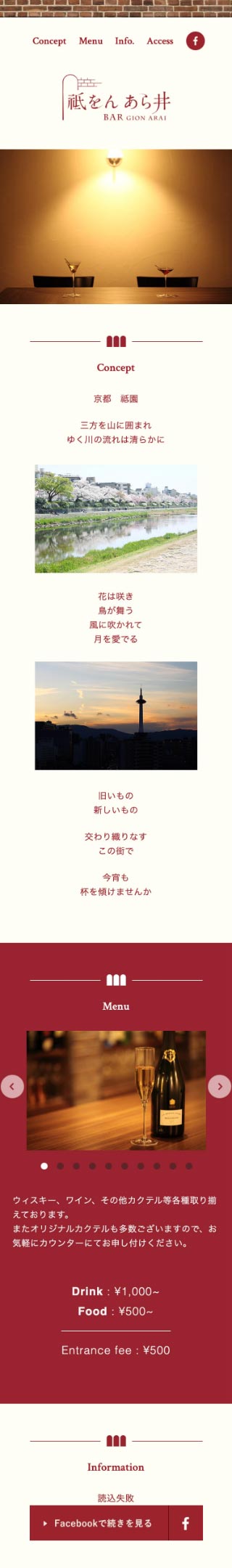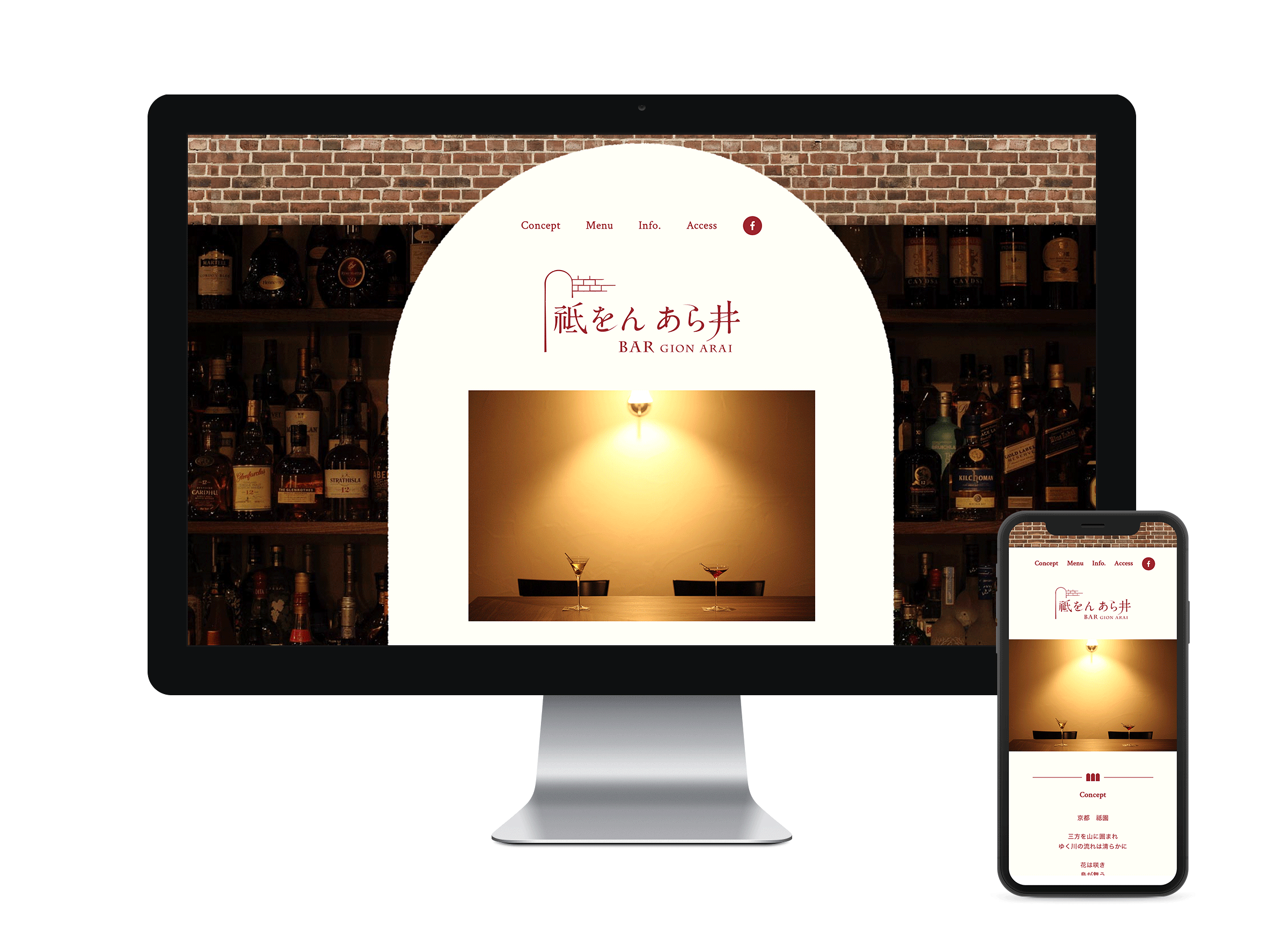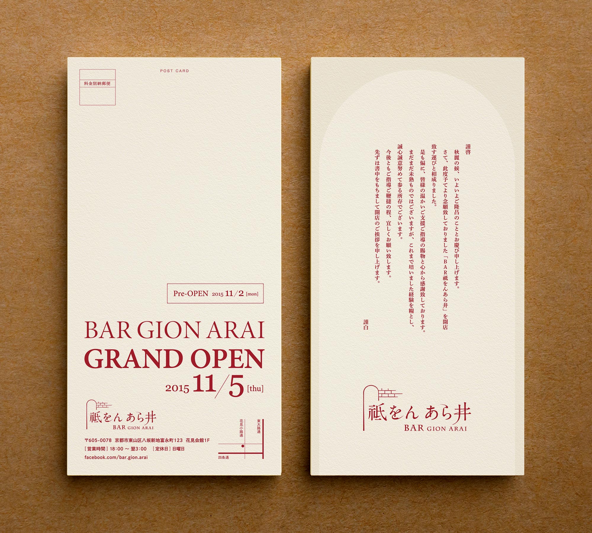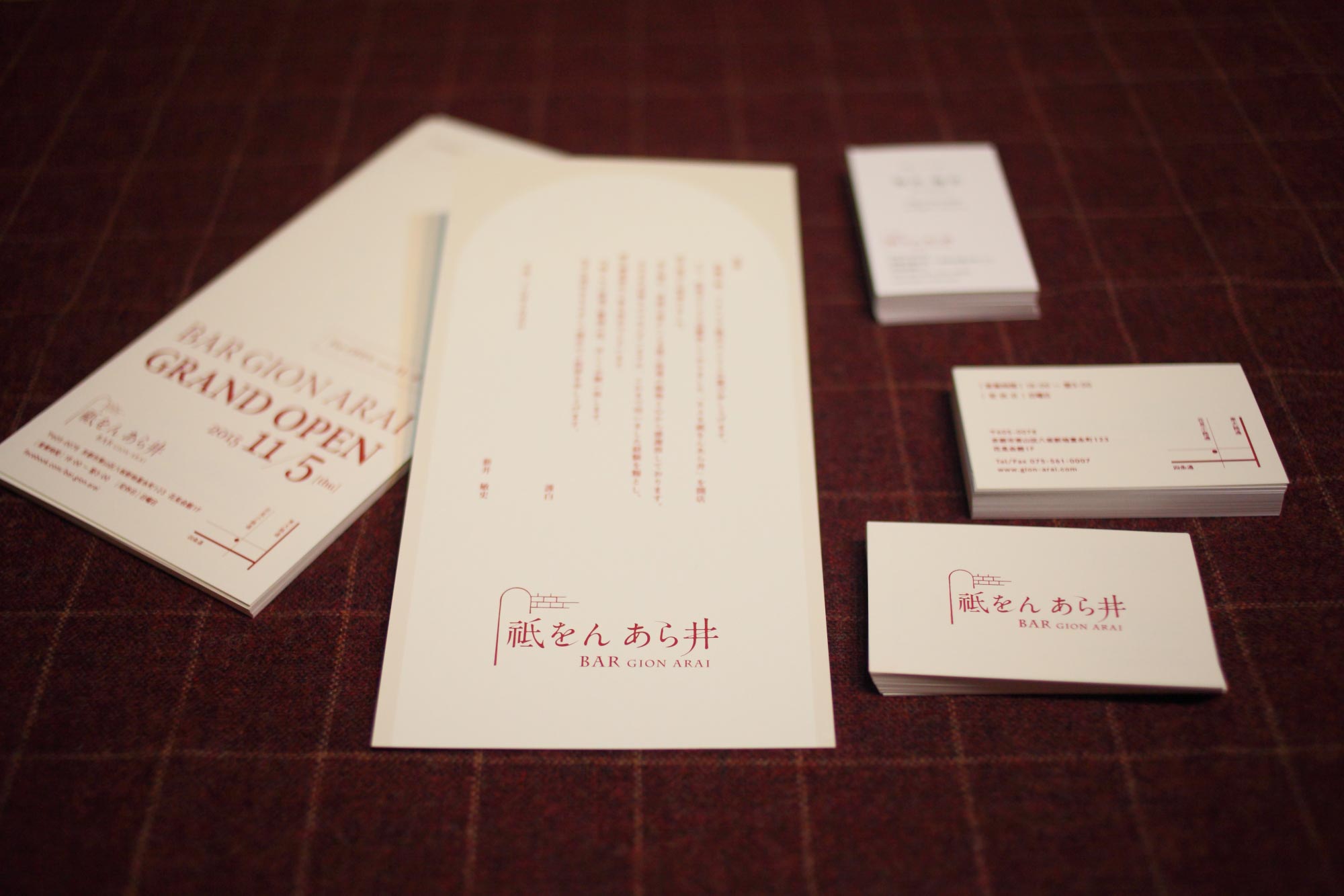 2015年にオープンした「バー 祗をん あら井」様の店舗ロゴをはじめとするブランディング、オープニングツール、撮影など一式を担当させていただきました。ロゴは店舗内装の設計やコンセプトを共有いただきターゲットとコンセプトのバランスをとり、3つの方向性を提案。ロゴが確定したのち案内状やWebサイトなど各ツールの制作を順次進行しました。