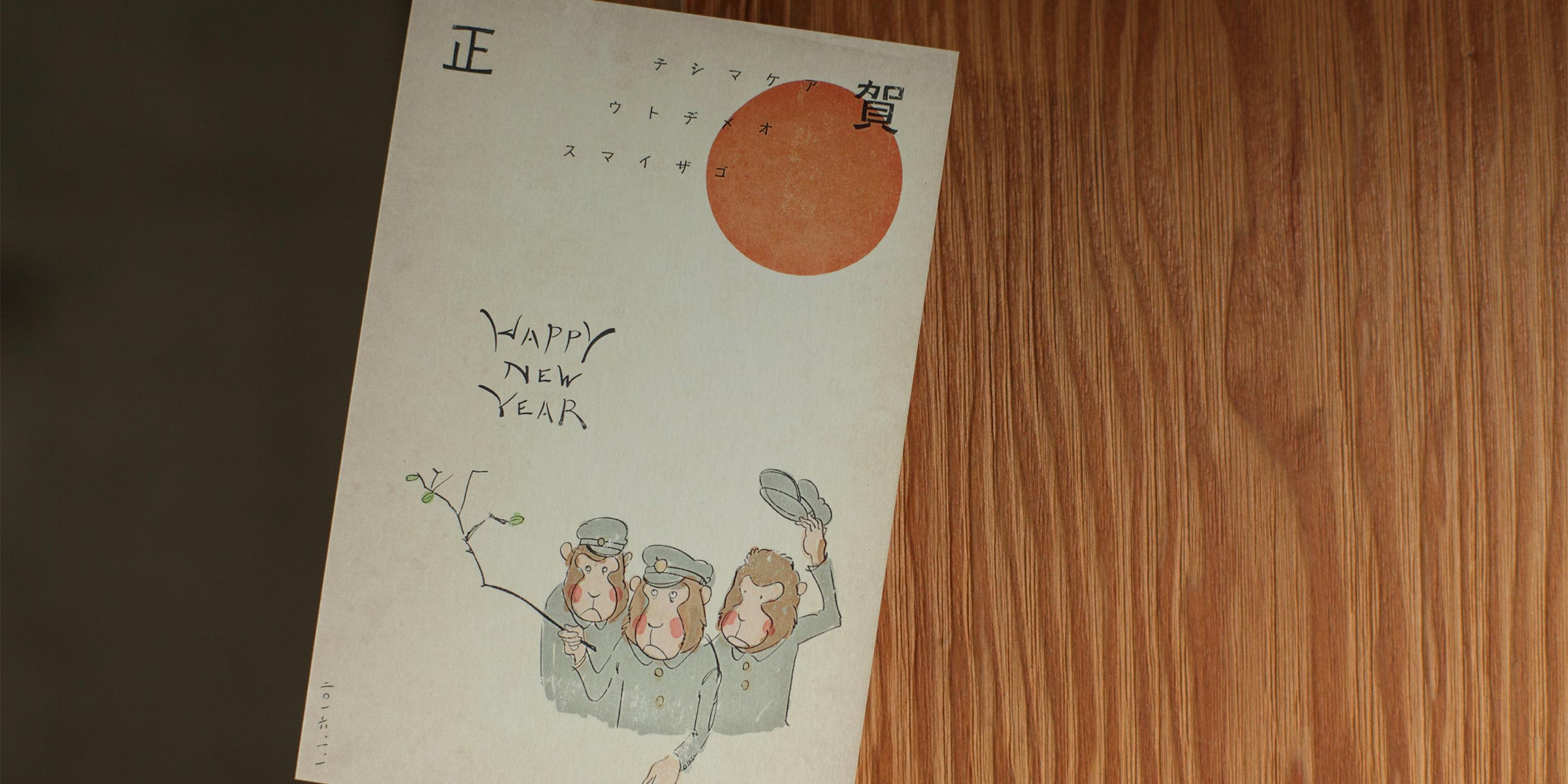 2016年、申年の年賀状です。この前の年、スマートフォンの「自撮り棒」が流行り、猿たちがとりあえず形だけを真似て「なんか違うな...」と感じている様子です。この年のかくれテーマは昭和風です。イラストはペンタブレットで描き起こしてます。古ぼけた紙に合成してかすれや滲み加工をしてなじませました。