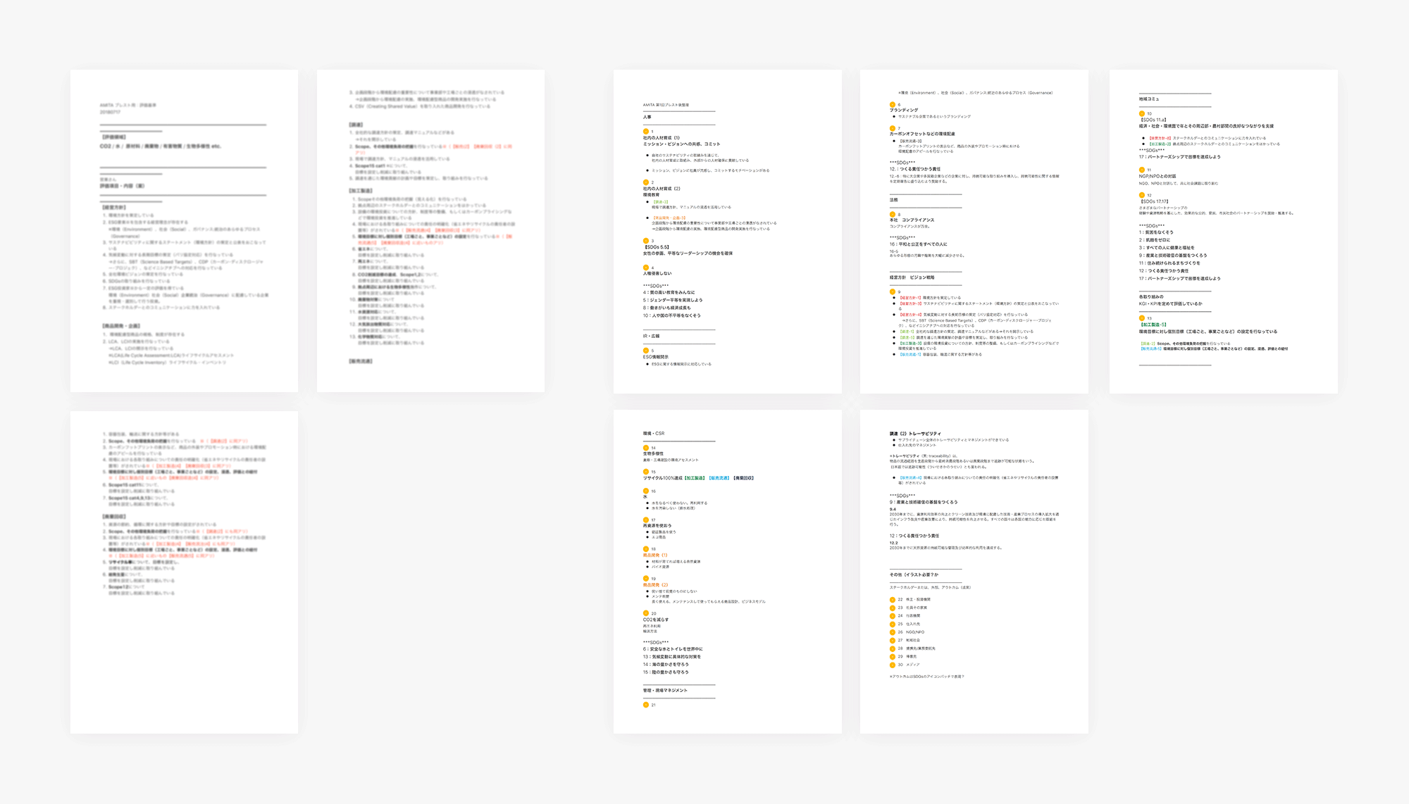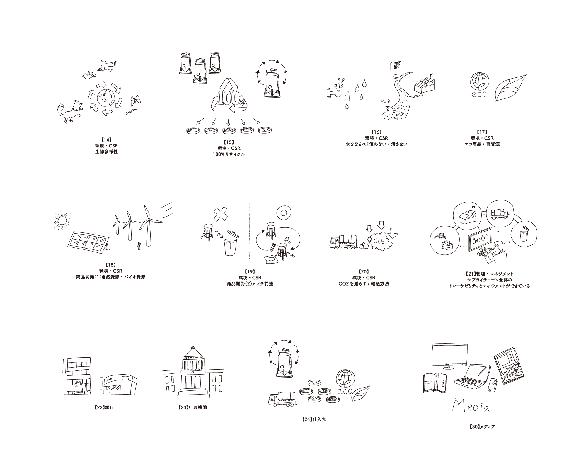 初期の段階ではイラストで表現したい内容や、落とし込むべき項目を資料やミーティングでのヒアリングから吸い上げリスト化します。