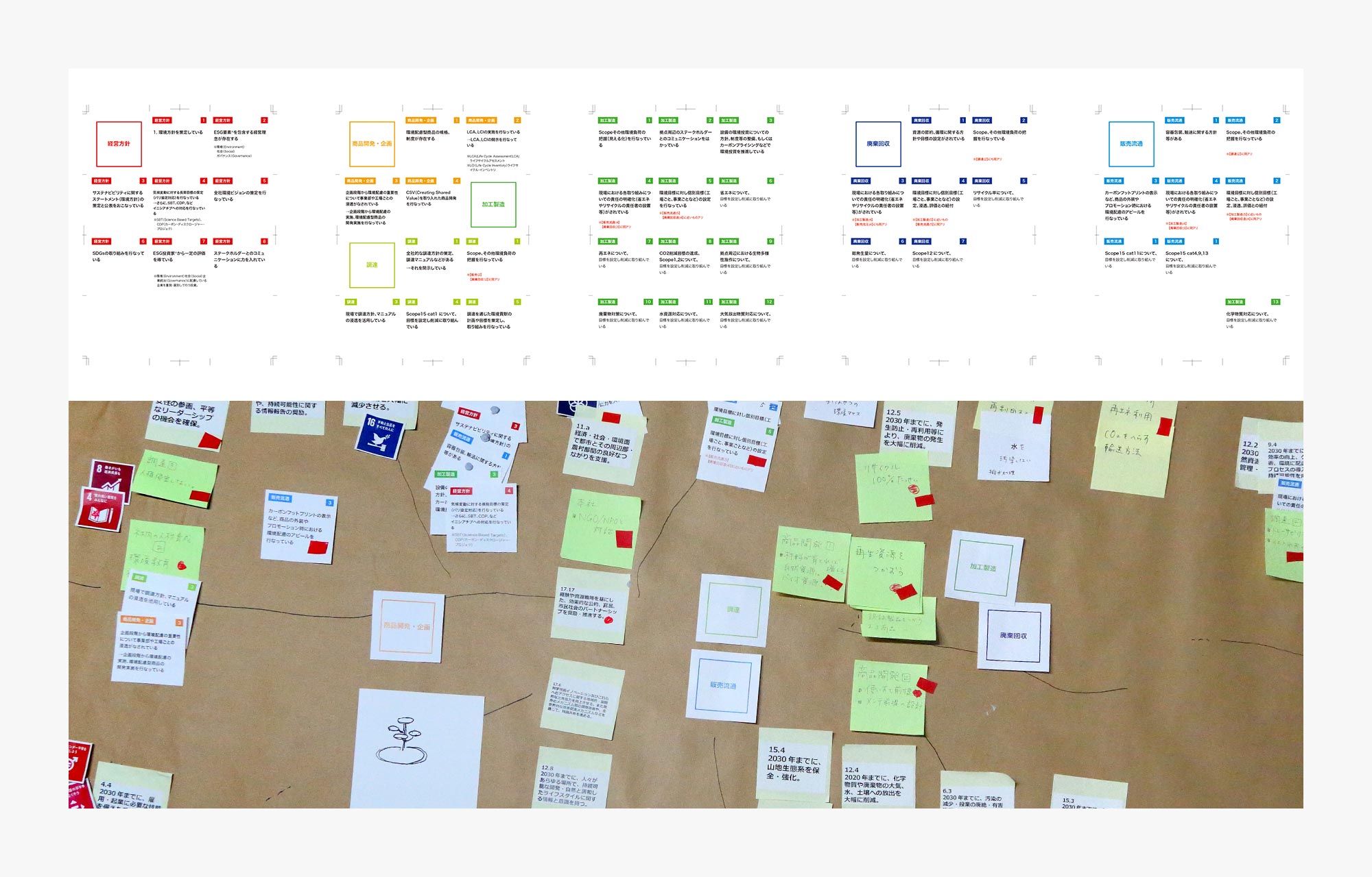 リスト項目を色分けしたカード状に出力、テーブル上で改めて相互の関係性などを確認。クライアント担当者様が最終的に整理し様々な部署どうしの関係性が視覚化され、この段階ではじめてツリーハウスのアイデアが持ち上がりました。