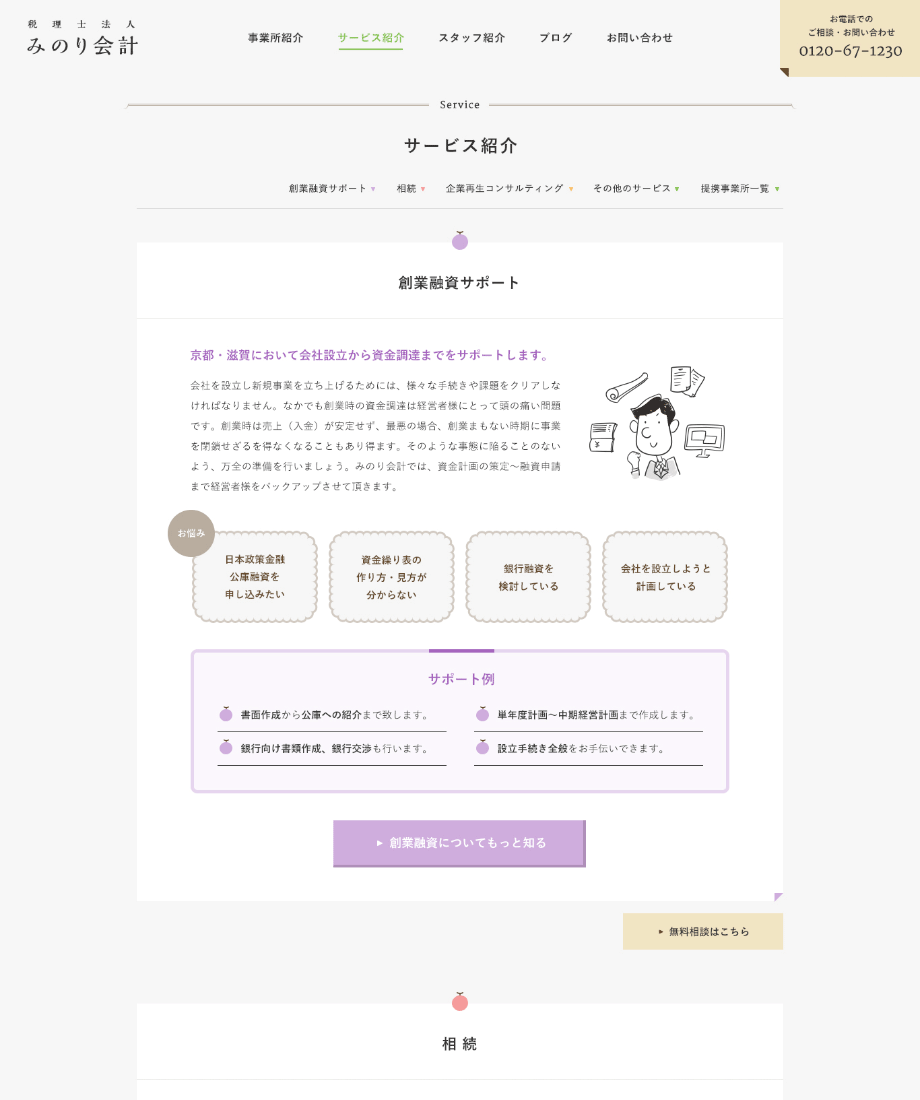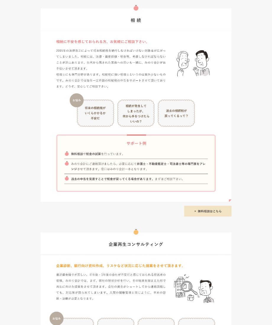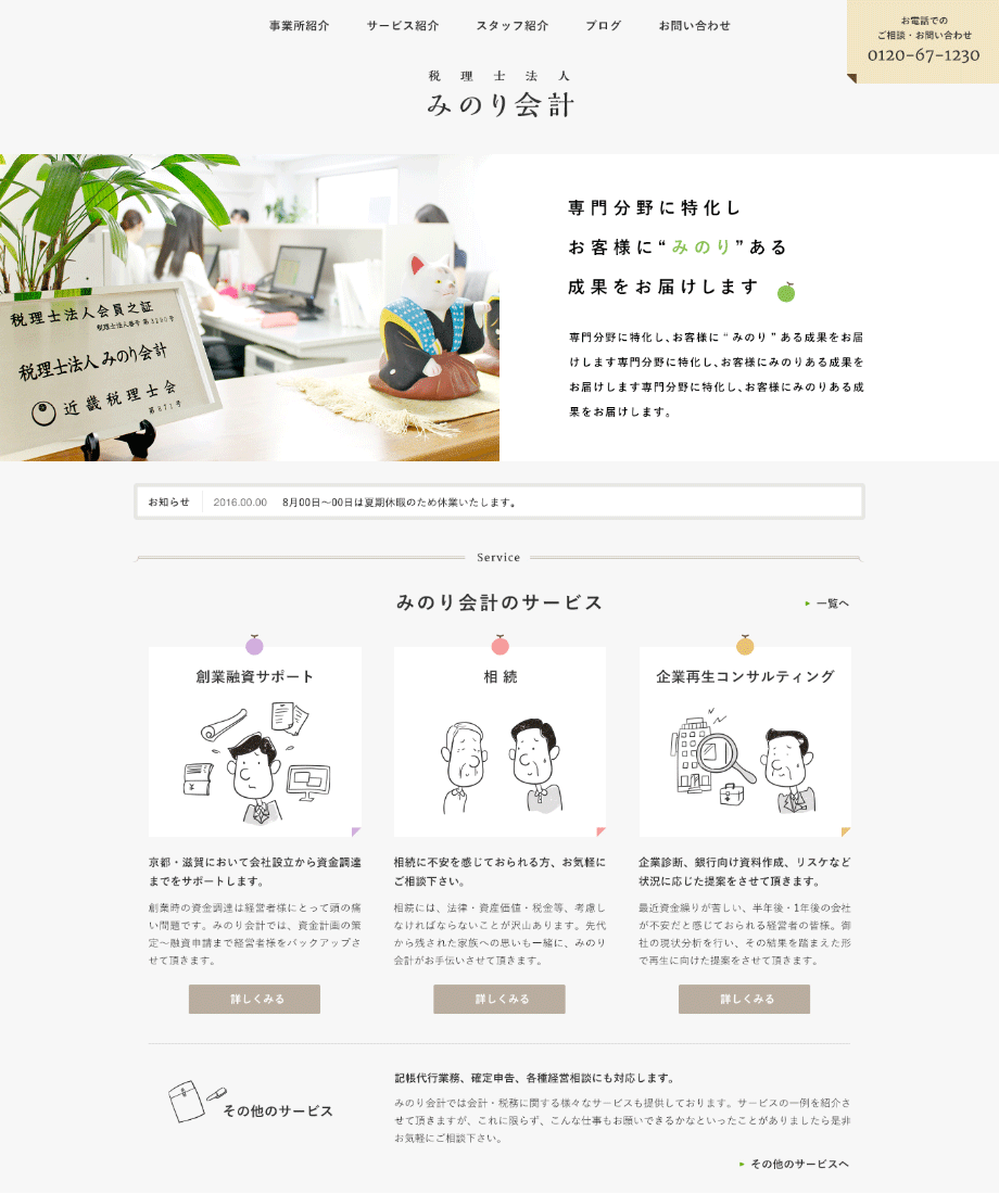 開業支援などを手掛ける「税理士法人 みのり会計」さまの新規webサイトのデザインとイラストを担当させていただきました。開業時の手続きや資金調達、相続などのサポートをされています。当時設立されて1年ほどの時期ということもあり、広報物などのブランディングやデザイントーンが確立していない中で、ビジネス寄りのデザインではなく相談したい人の気持ちを想像し、身近で親近感のあるデザインとイラストのテイストを提案しました。
