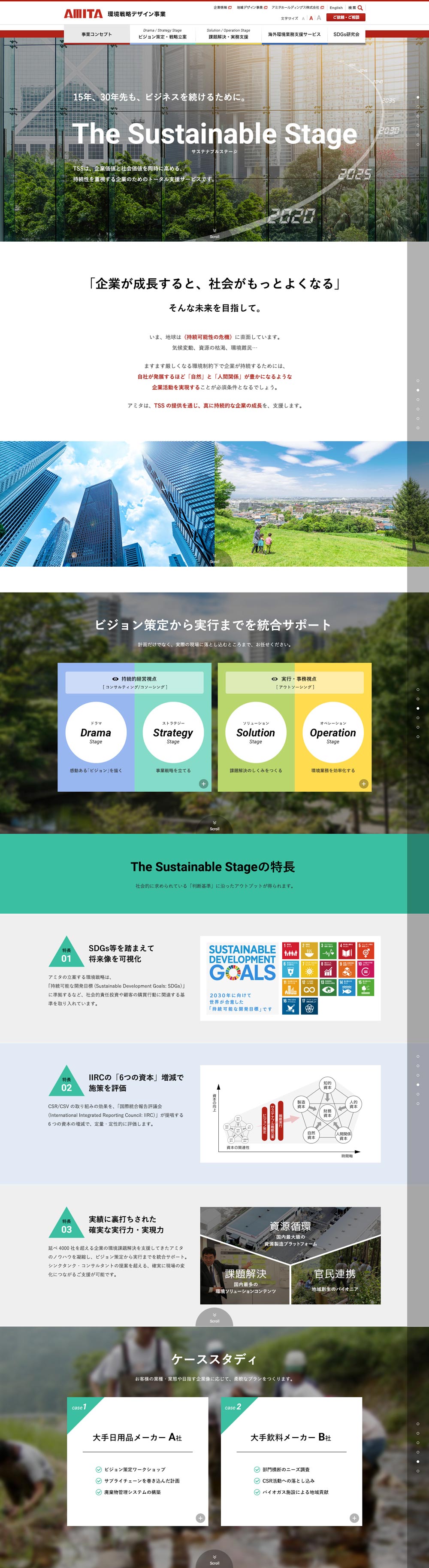 アミタ株式会社様サイト内のコンテンツです。事業コンセプトからサービス内容、ケーススタディまで網羅する1ページです。既存の企業サイトの中でフォーマットにとらわれずヘッダー以下をフルスクリーンでダイナミックに構成、メッセージを強く伝えます。難しくなりがちな内容を印象的な写真やレイアウトで魅力あるページにすることを目指しました。