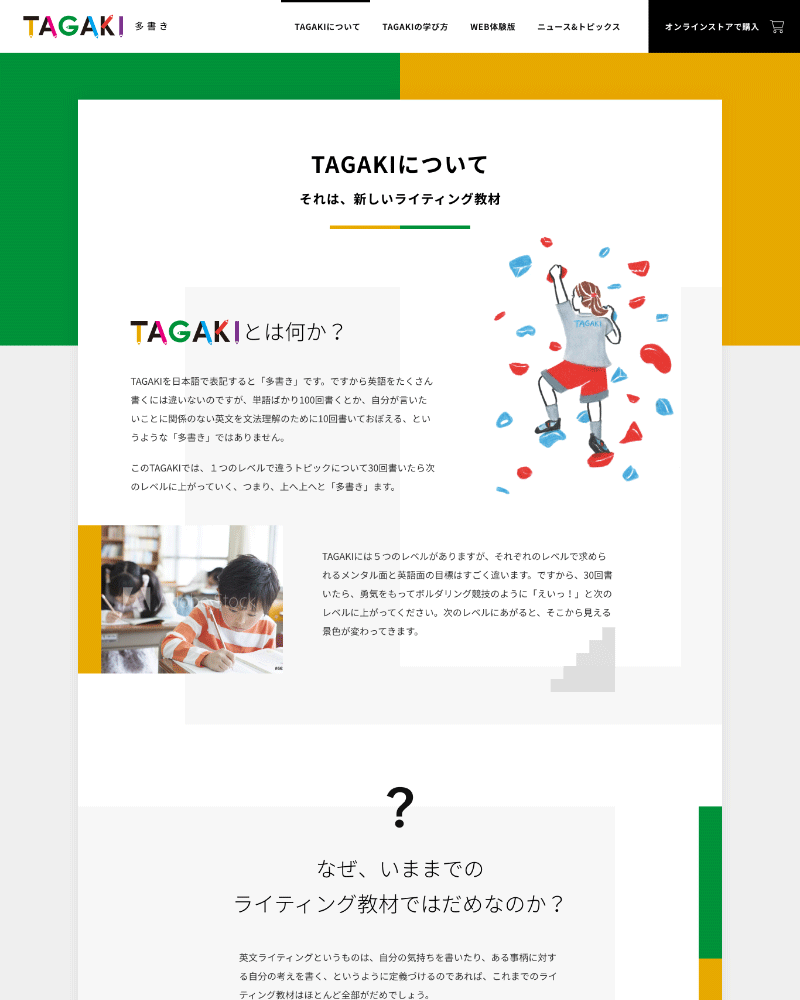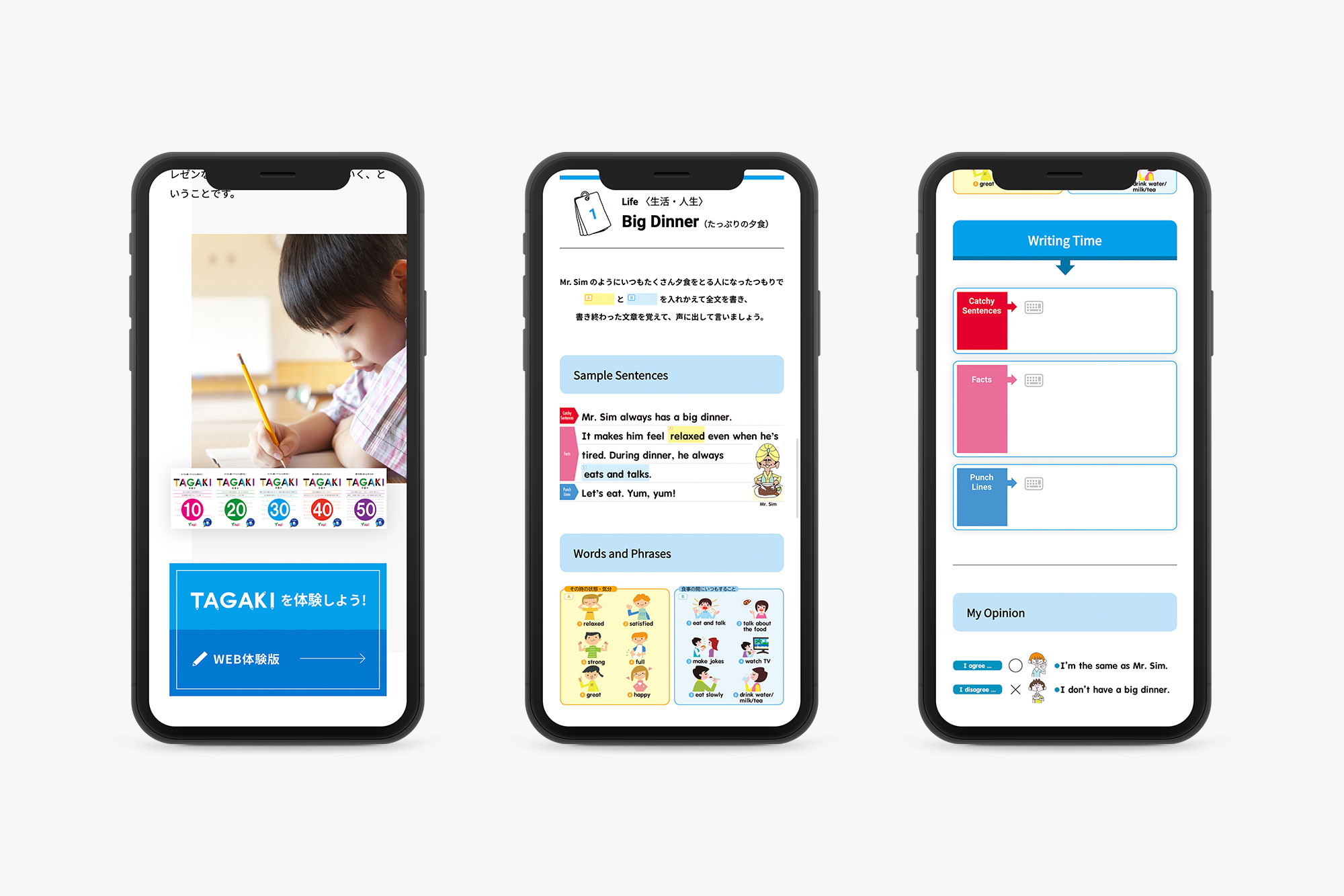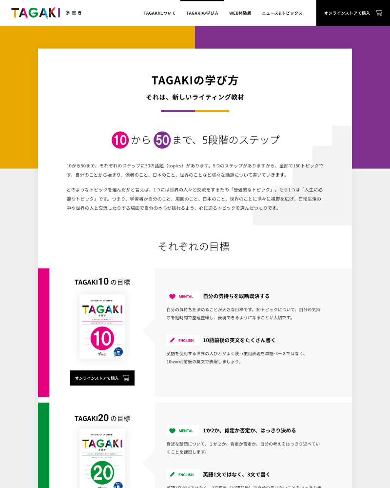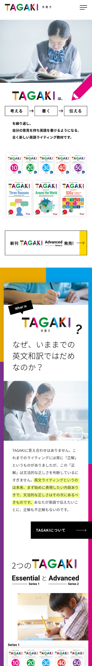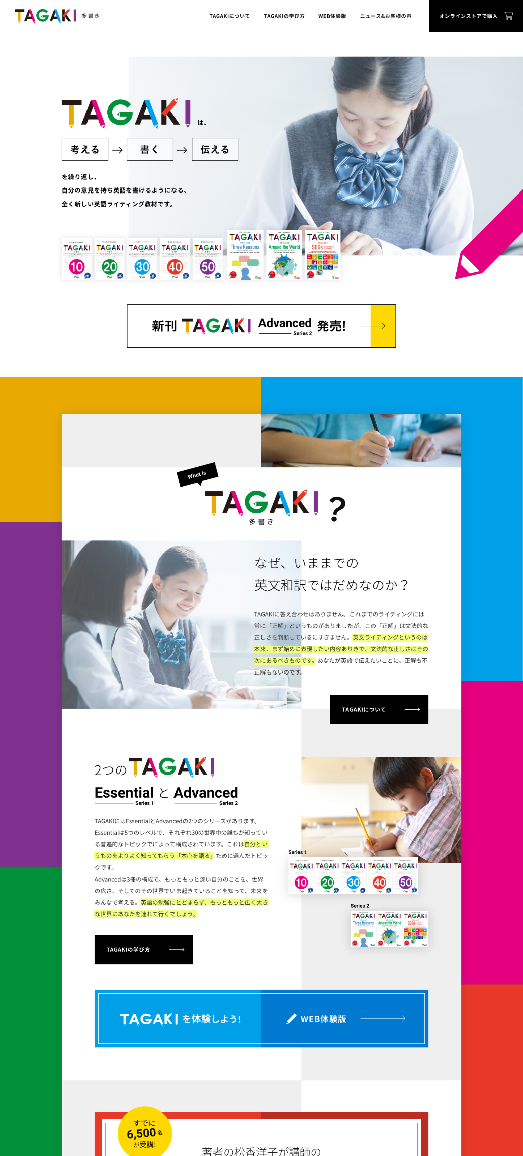 小学生〜中学生を対象とした新しい英語ライティング教材「TAGAKI (多書き)」の公式Webサイトのデザインを担当させていただきました。すでにブランディングされていたロゴ、教材本誌のイメージやカラー設計を踏襲しつつ、サイト上での伝わり方を意識した表現、また下層ページでは一つの色だけが強くならないよう各コンテンツやステップごとに配色を変更しました。2018年秋に制作を開始し、Adobe XDでのデザインを導入した初期の事例です。