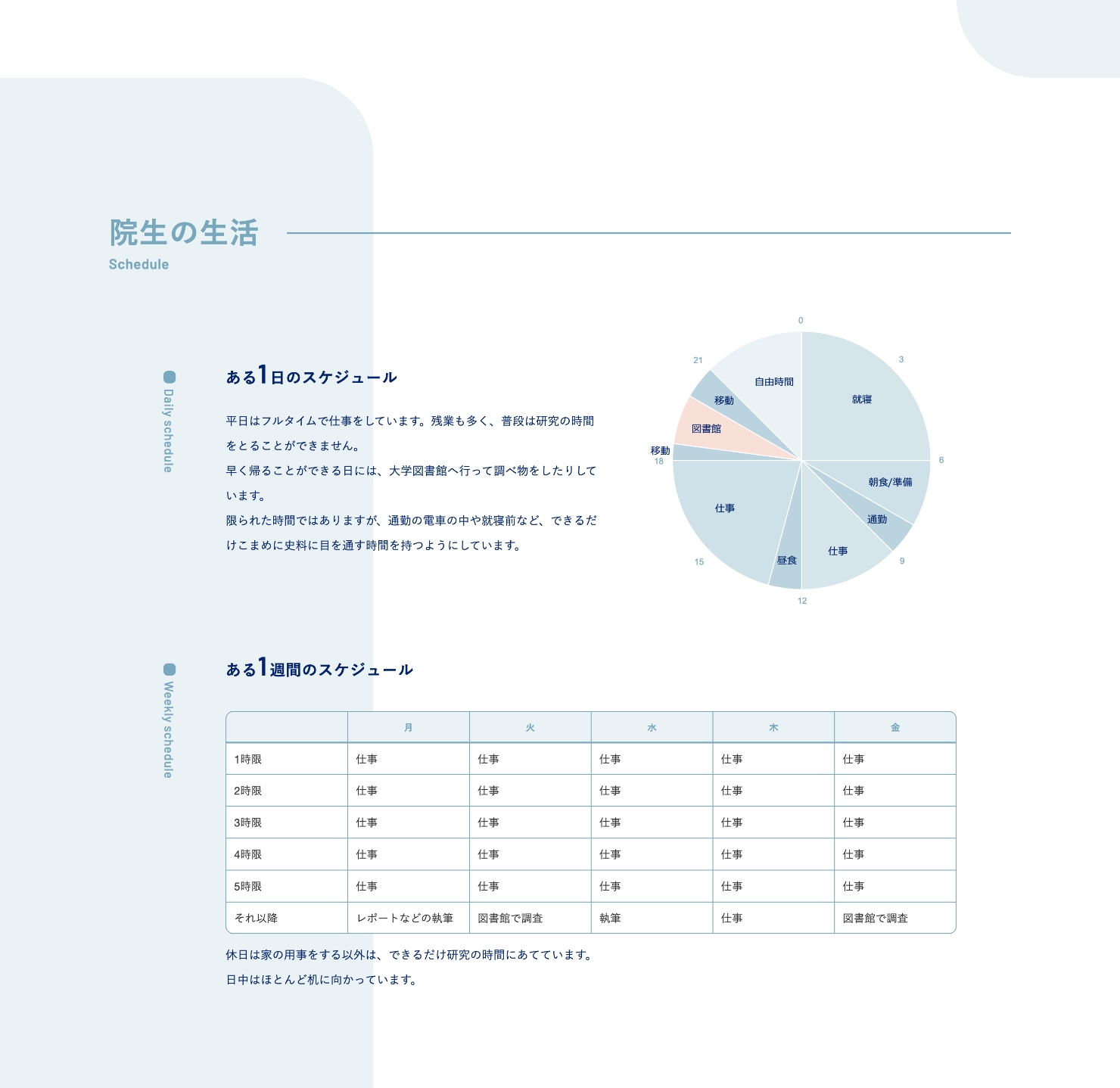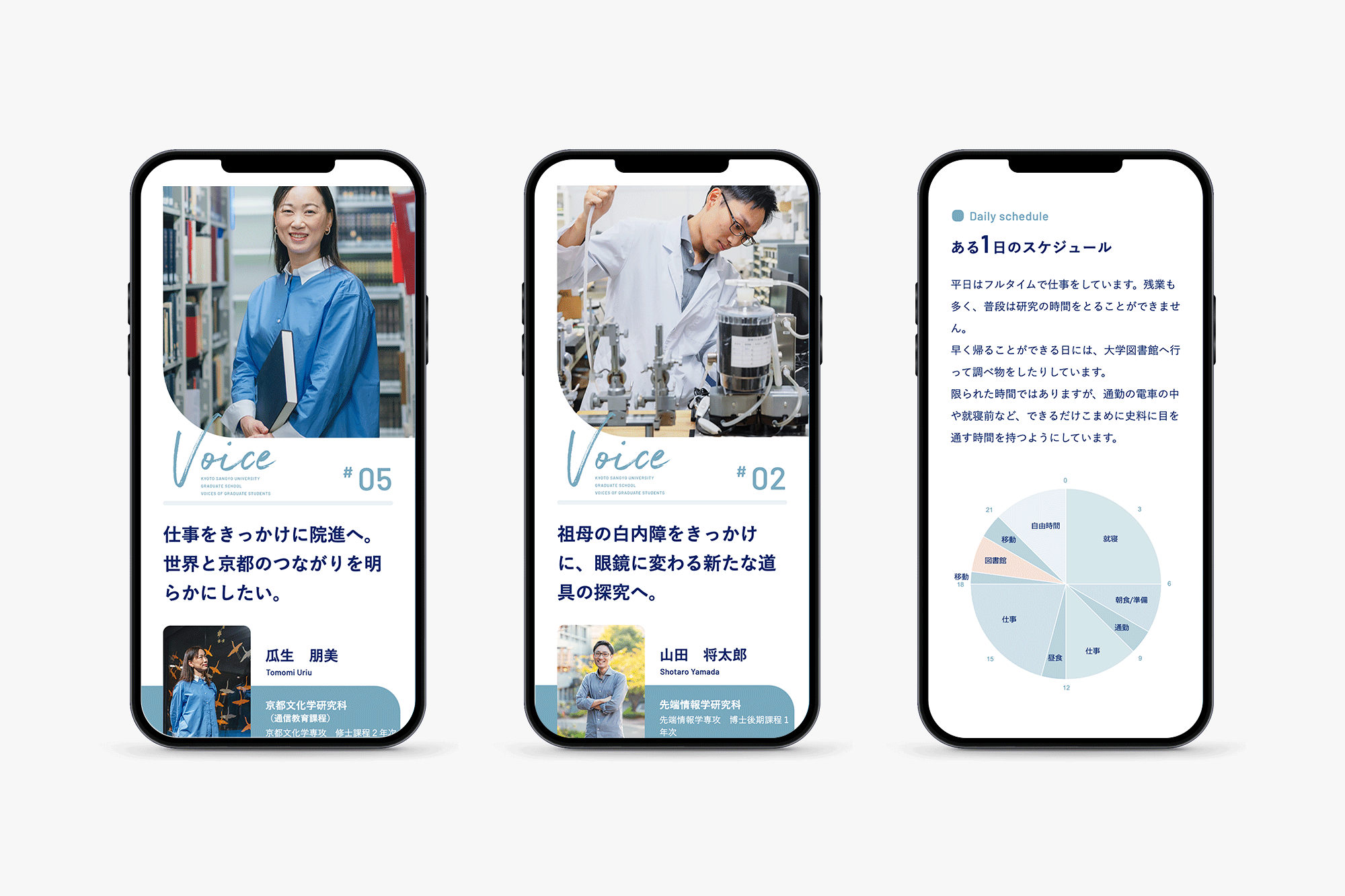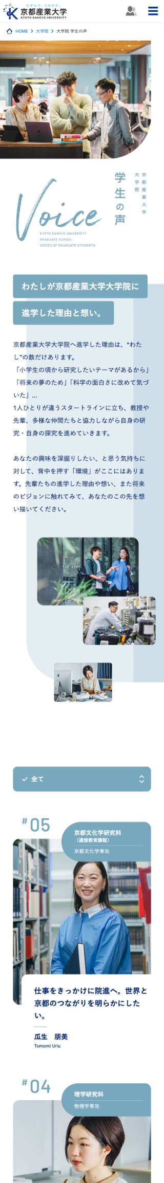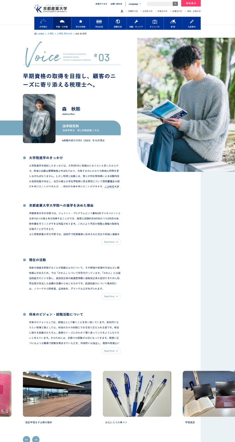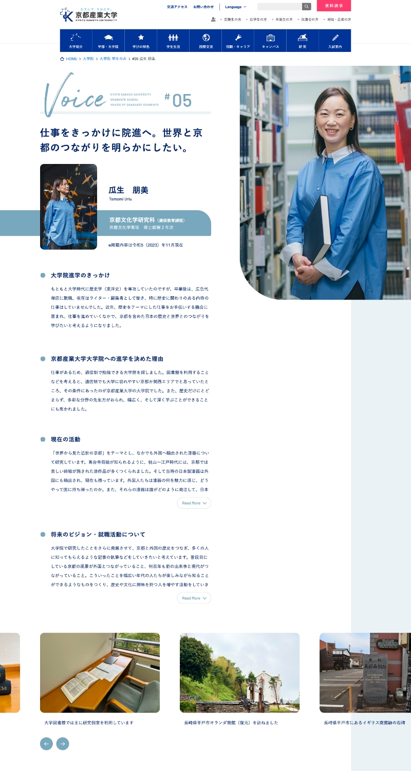 2015年のリニューアル以来、これまでコンテンツの不足していた大学院のページに、インタビュー記事コンテンツがアップされました。 大学院ということもあり、これまでの大学サイトのカラートーンから変化をつけ、落ち着きのある単色のカラー設計で専門性とモダンな印象を意識し、コンテンツとしての独立性も出しました。 更新コンテンツなので今後の記事が増えた場合もイメージしながらレイアウトを設計。個人の詳細ページは汎用性や先方様でのグラフの作成、更新なども可能なデザインしています。